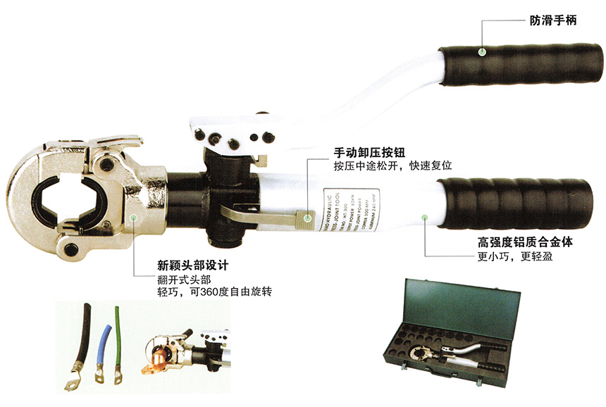 ■ C型鉗頭且可360度旋轉,在完全壓接后自動卸壓,必要時也可手動卸壓;